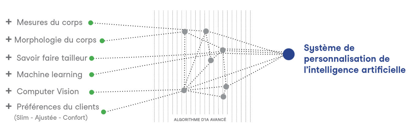 Grâce à notre base de données riche de 10 années d’expérience et à notre outil de machine learning, ce scan déterminera ensuite le patronnage qui servira à la fabrication du vêtement.